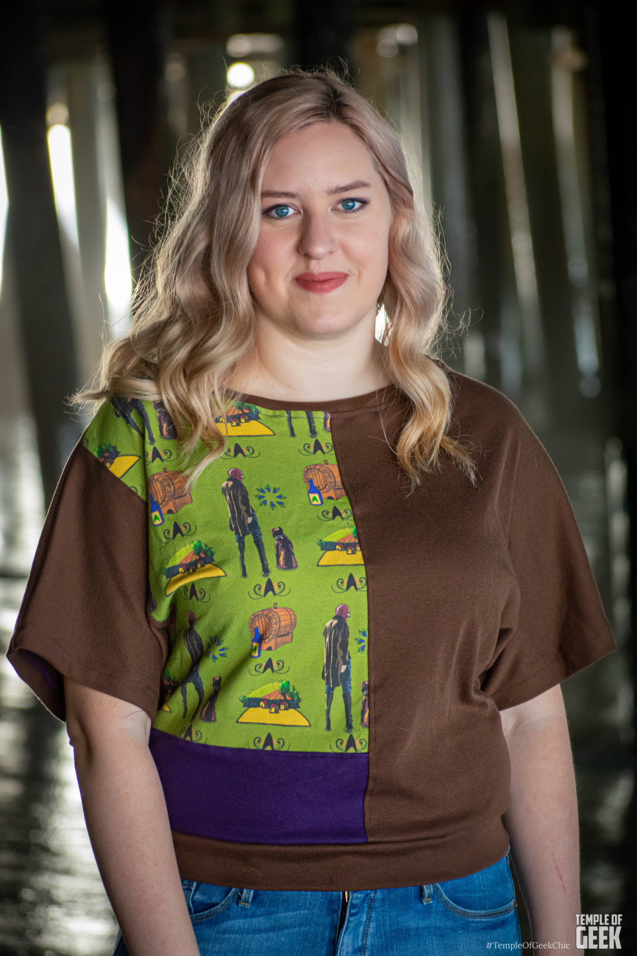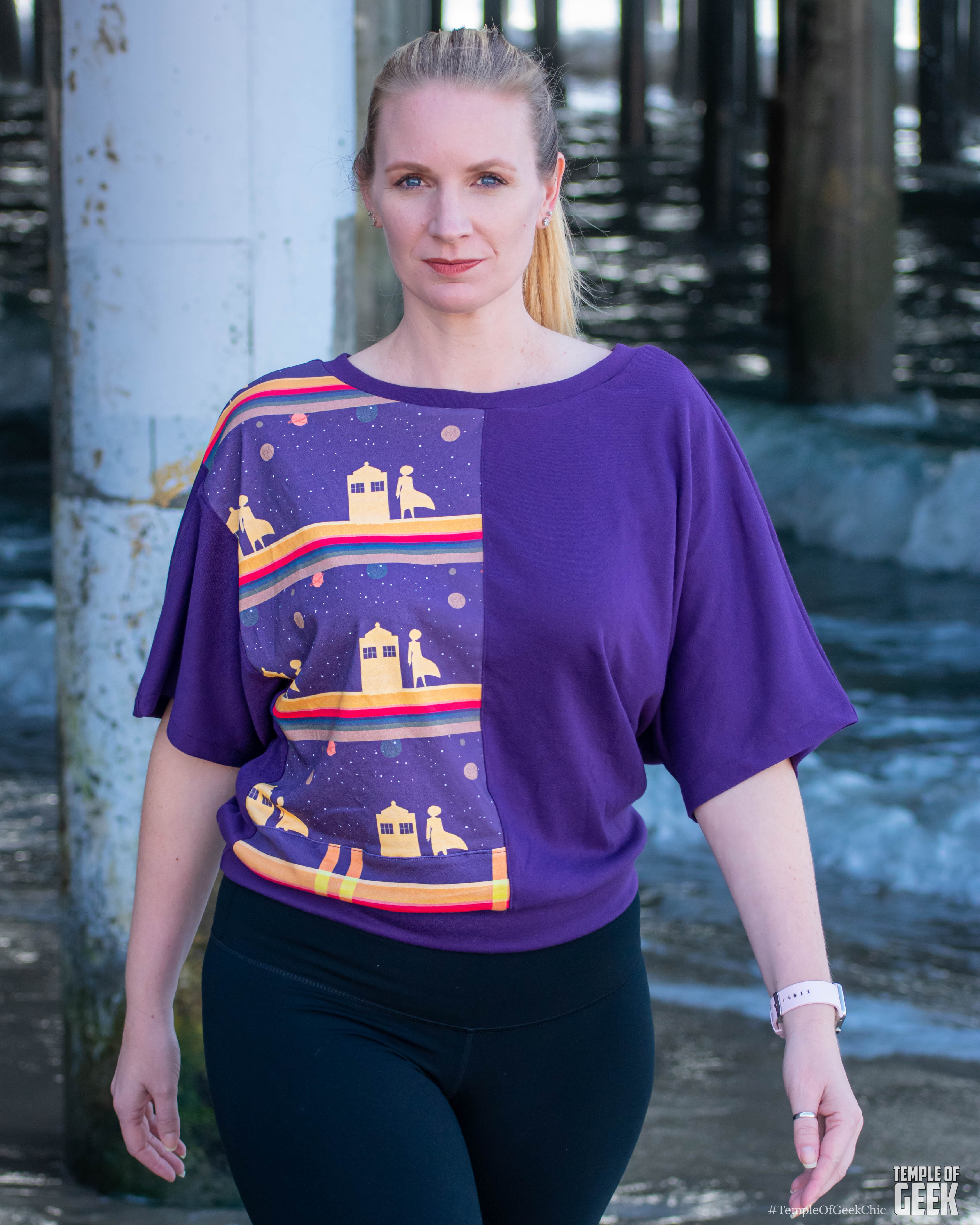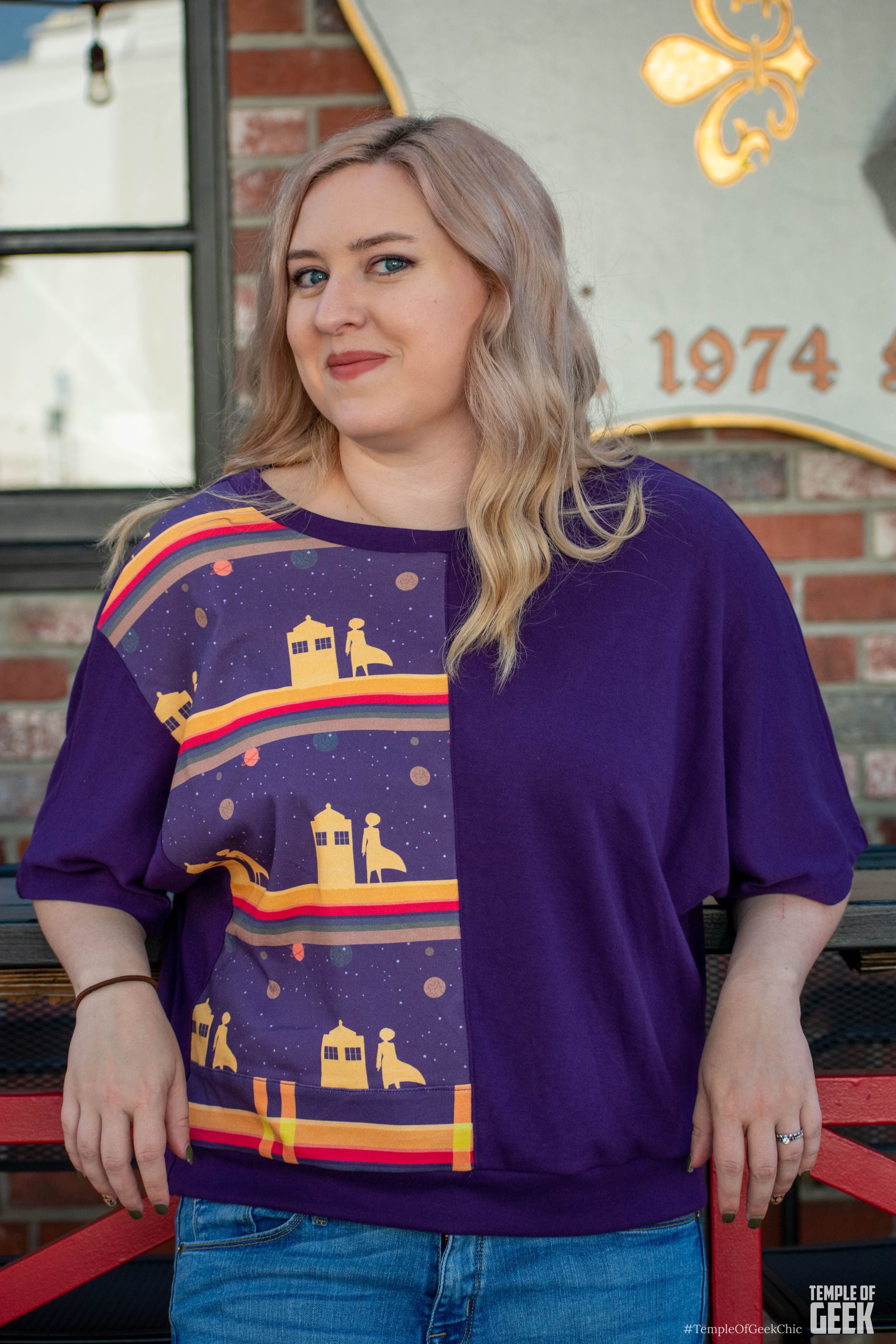 Both Erin and Christy modeled this Doctor Who-inspired top, which illustrates its versatility. It could be sized down for a dressy-casual look or sized up as a slouchy workout top over yoga pants.