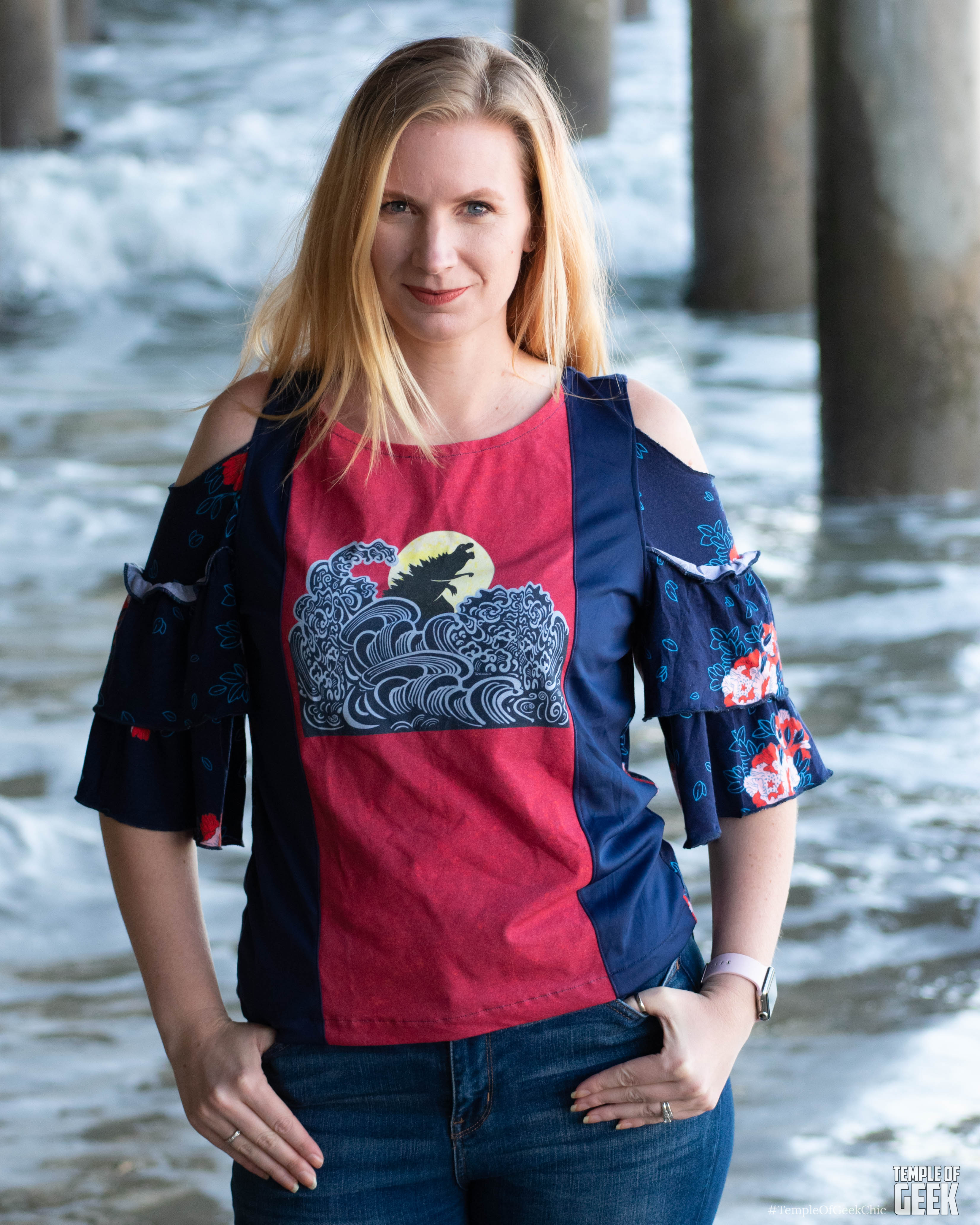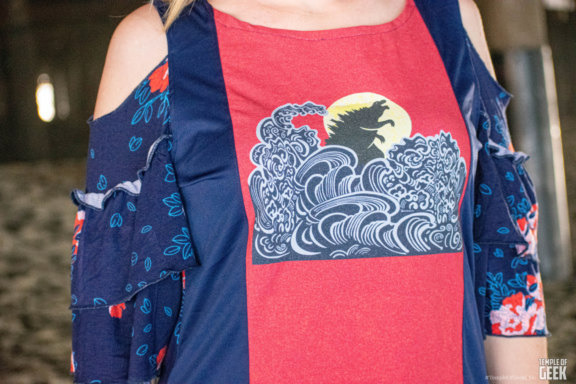 What we love about it: From the back and side, this design simply looks like a pretty, brightly patterned top. When viewed from the front, it reveals its geeky side which is a gorgeous homage to the giant monsters of Japanese cinema. This shoulder-baring top is stretchy and forgiving, and we love the contrast of the deep blue with pops of pink and rust.