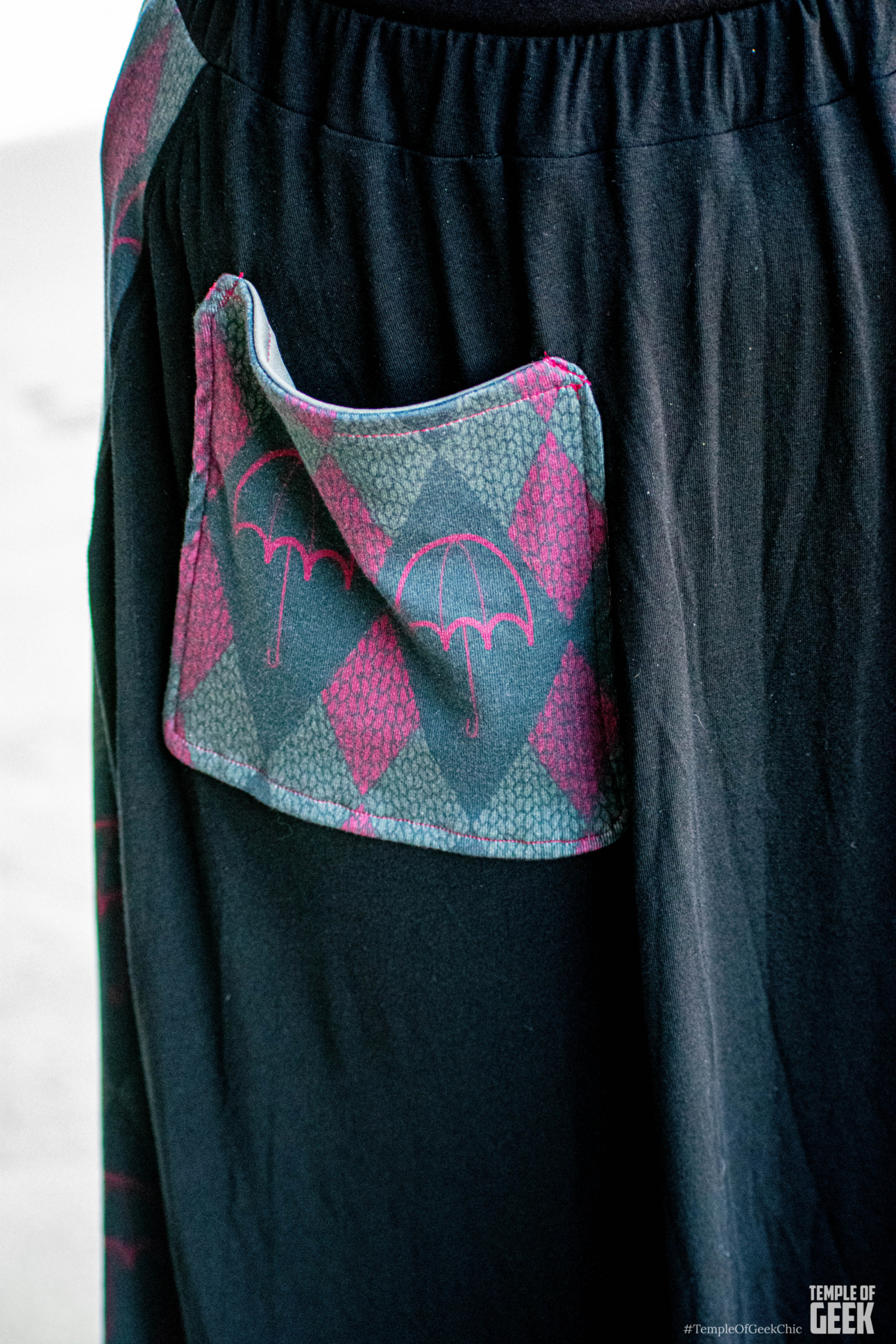 What we love about it: The subtle umbrella pattern on the pocket and side panels of the skirt, along a stripe of burgundy at the hem, is the perfect homage to a fandom we can’t get enough of, whether it’s the Netflix series or the original comic.