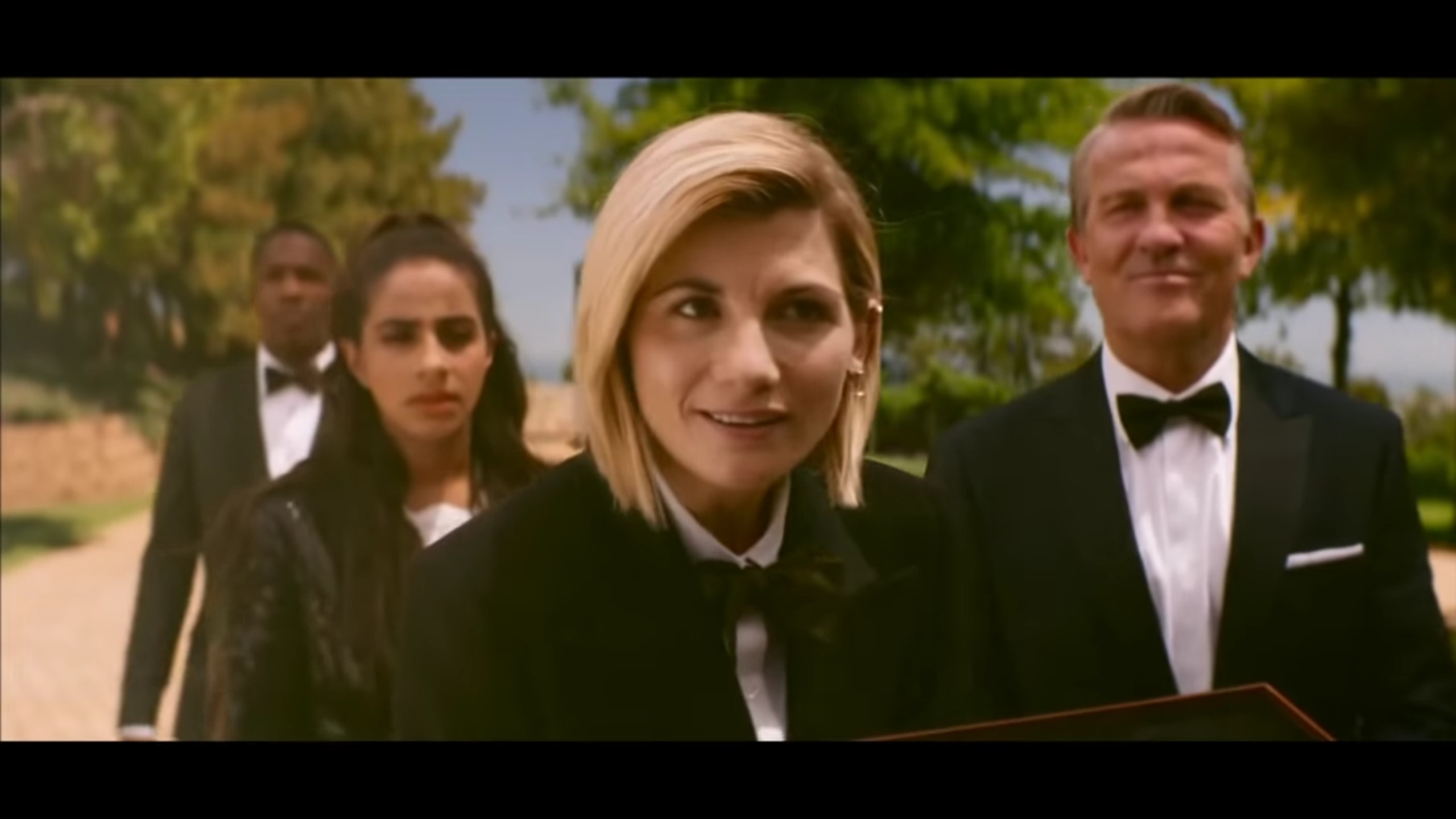 In the trailer, we see the Doctor introducing herself as she and her fam are sporting tuxedos. Stephen Fry appears in the opening, just as BBC announced. He is asking the Doctor if she can be trusted with the security of the planet. There is, of course, a lot of running and dodging explosions.