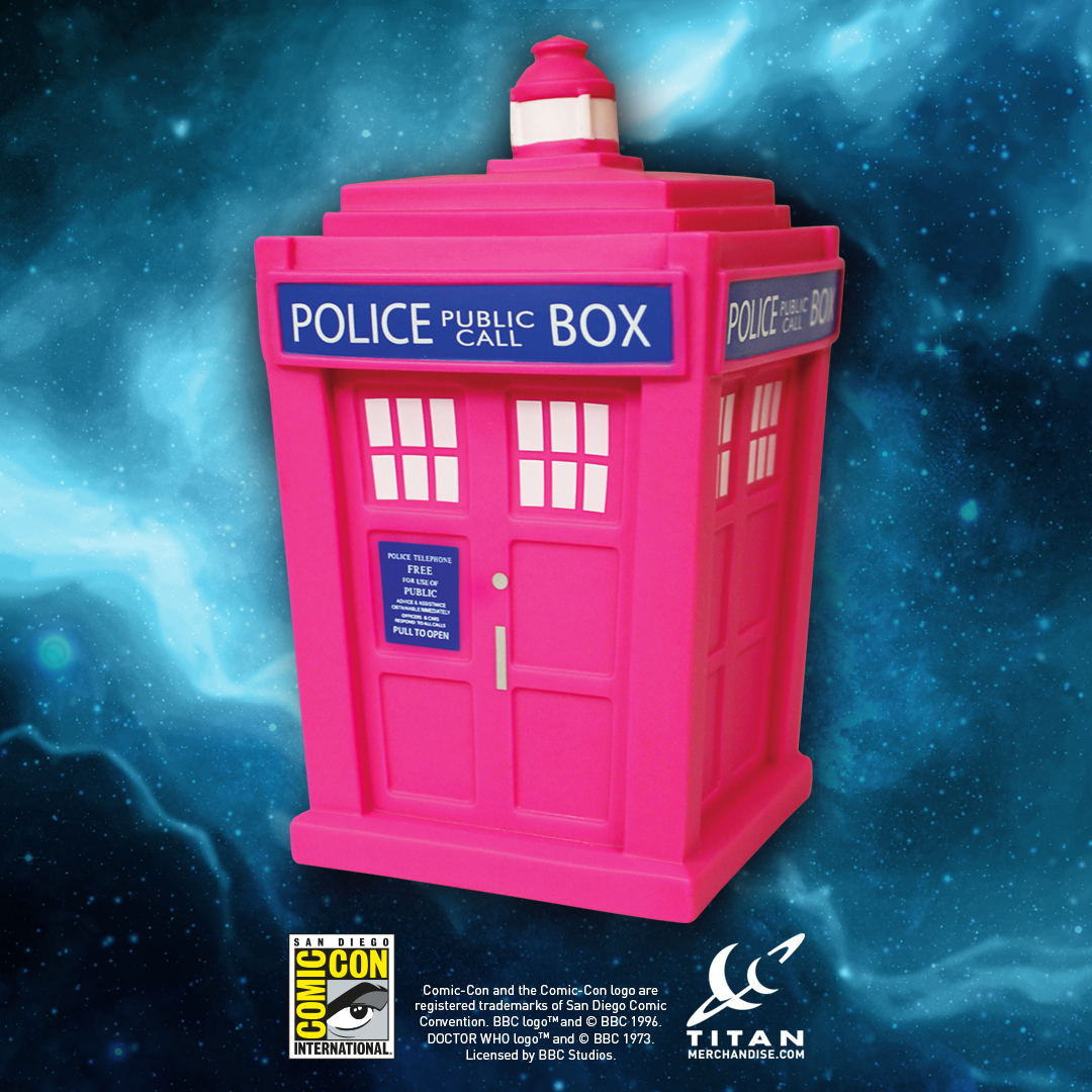 - Doctor Who: Pink “Happiness Patrol” TARDIS – 6.5″ TITAN Vinyl Figure – Another globally exclusive figure celebrating the Fifteenth Doctor.