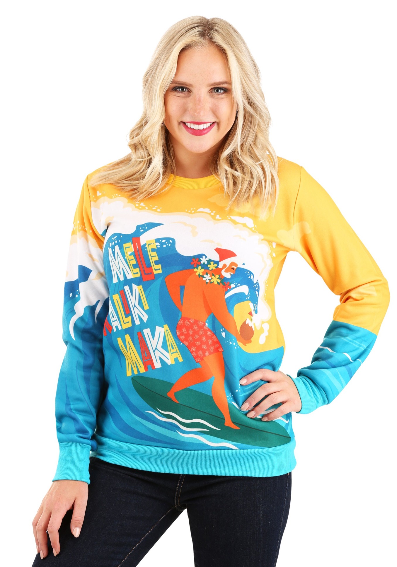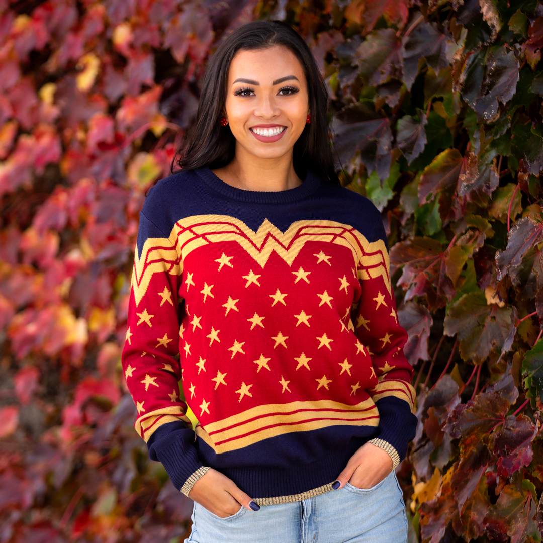 This is an officially liscened Wonder Woman Ugly Christmas Sweater. with ease. An acrylic sweater with rib-knit cuffs, waistband, and neckline. A dark blue base with the Wonder Woman iconic stars and stripes wrap and logo. Available here.